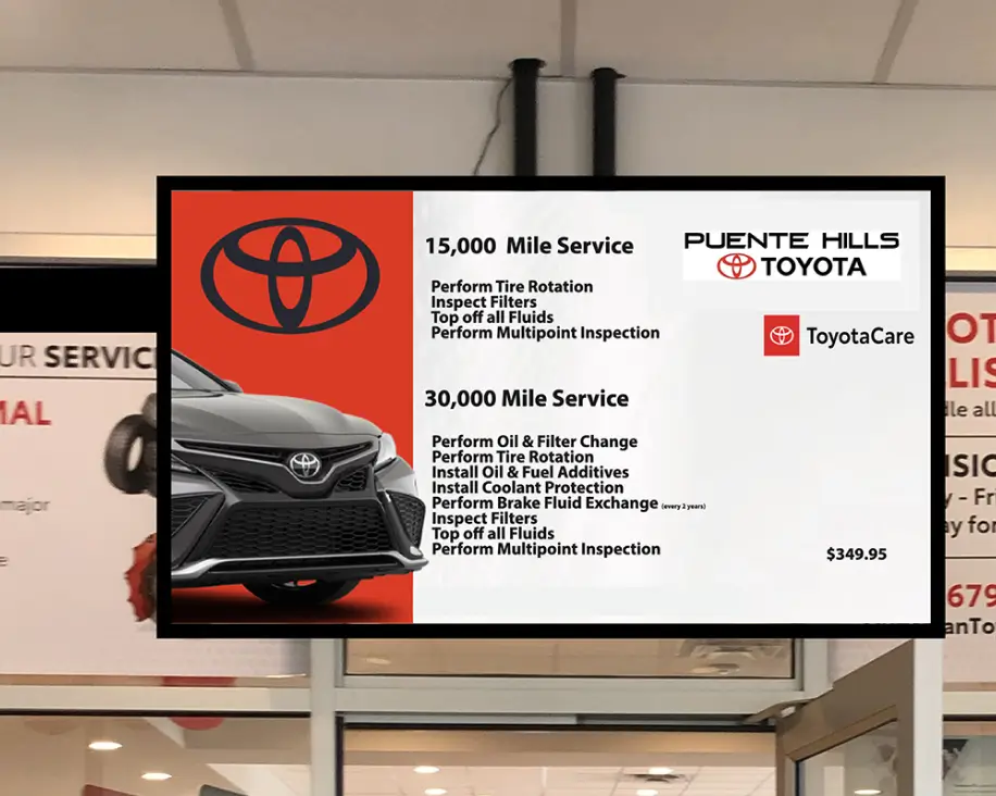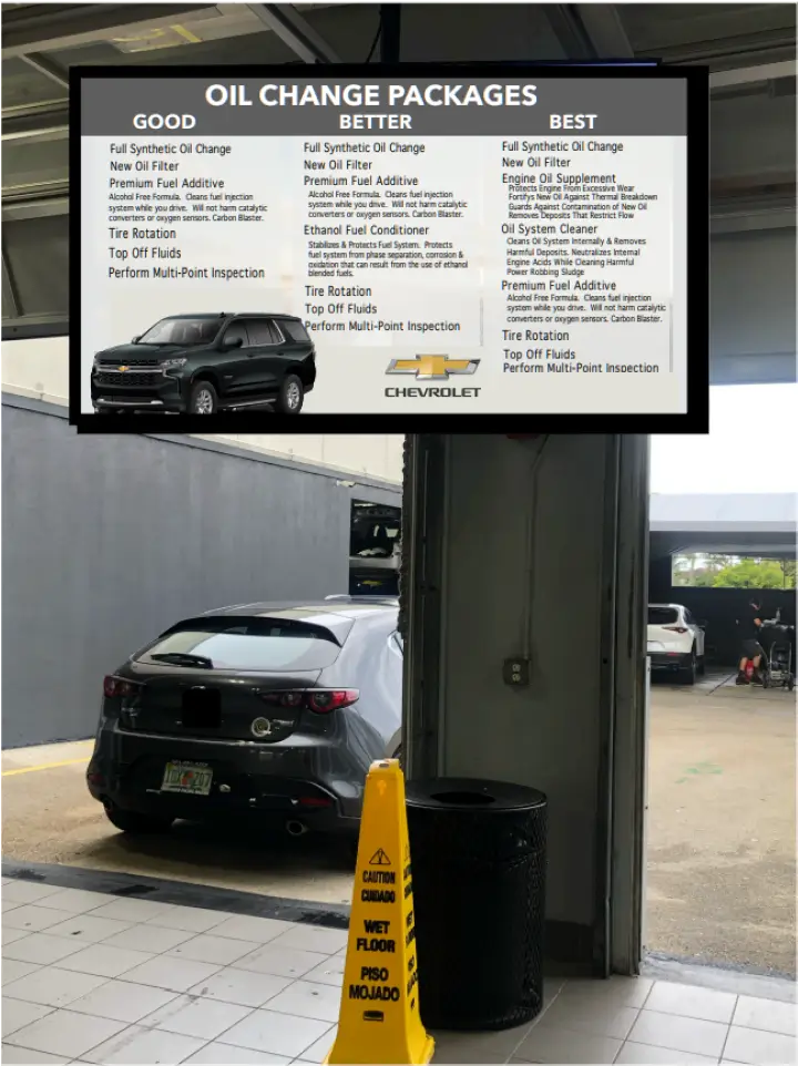 For your TV screen, we’ll create your video loop with your service menu and we’’ll add videos on tires, alignments, fluid exchanges, fuel systems services, etc. We’ll also provide the equipment to attach to your TV to loop media 24/7. This service is “plug & play” meaning turn your TV “on” and the media will play and loop.